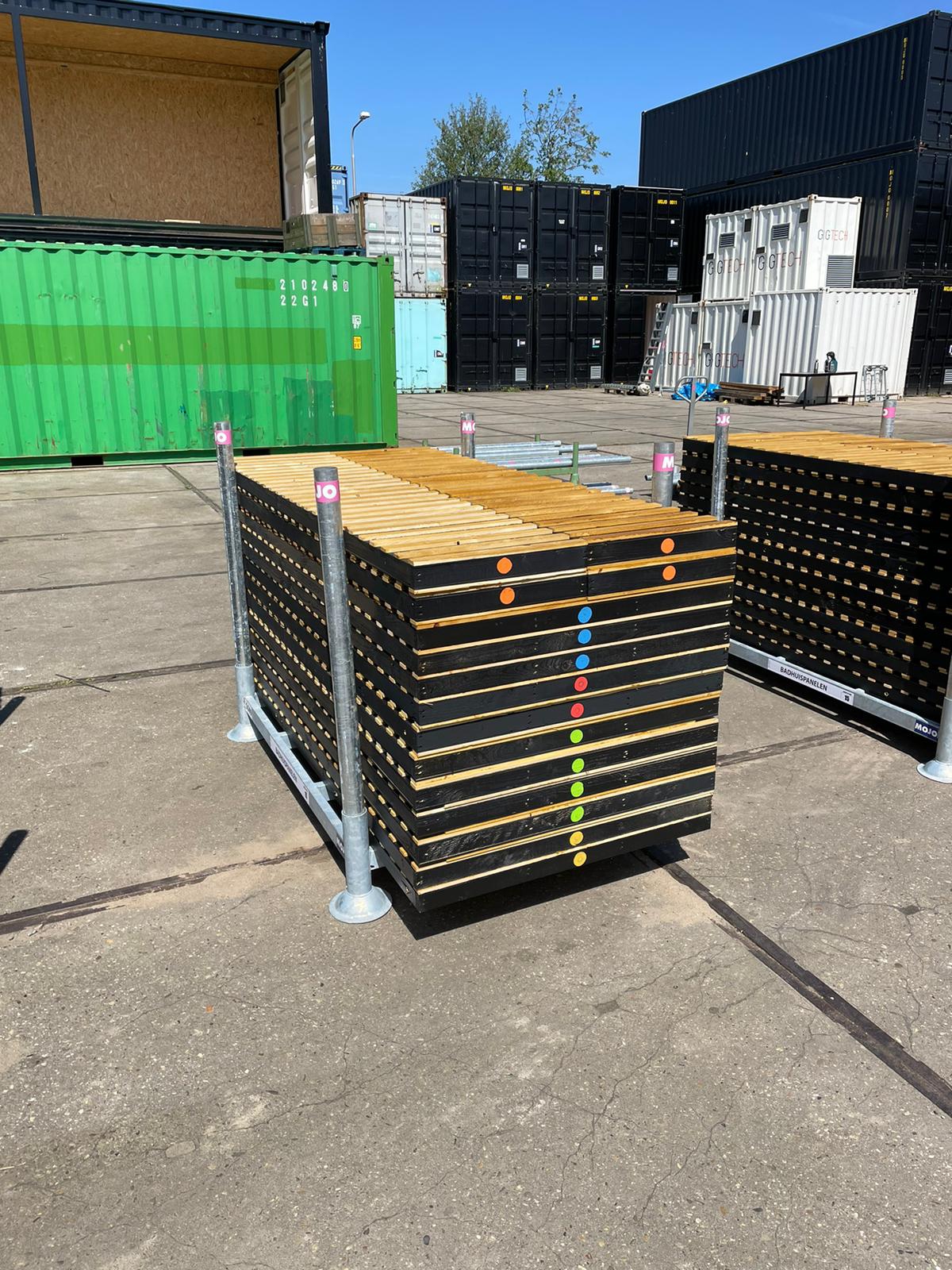 Combinatie van verschillende houtenwanden die samen een afscheiding maken voor de badhuizen.