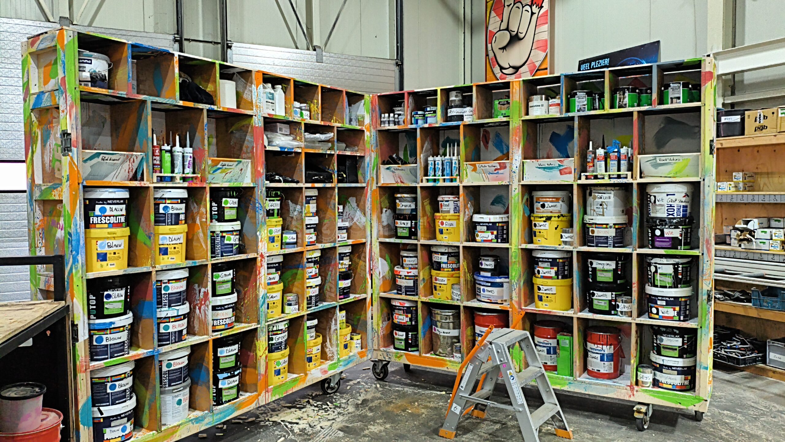De kast is gevuld met allerlei soorten verf, ook zitten er alle toebehorenen voor verfen bij. De kitspuiten en bussen zitten ook in deze kast.
