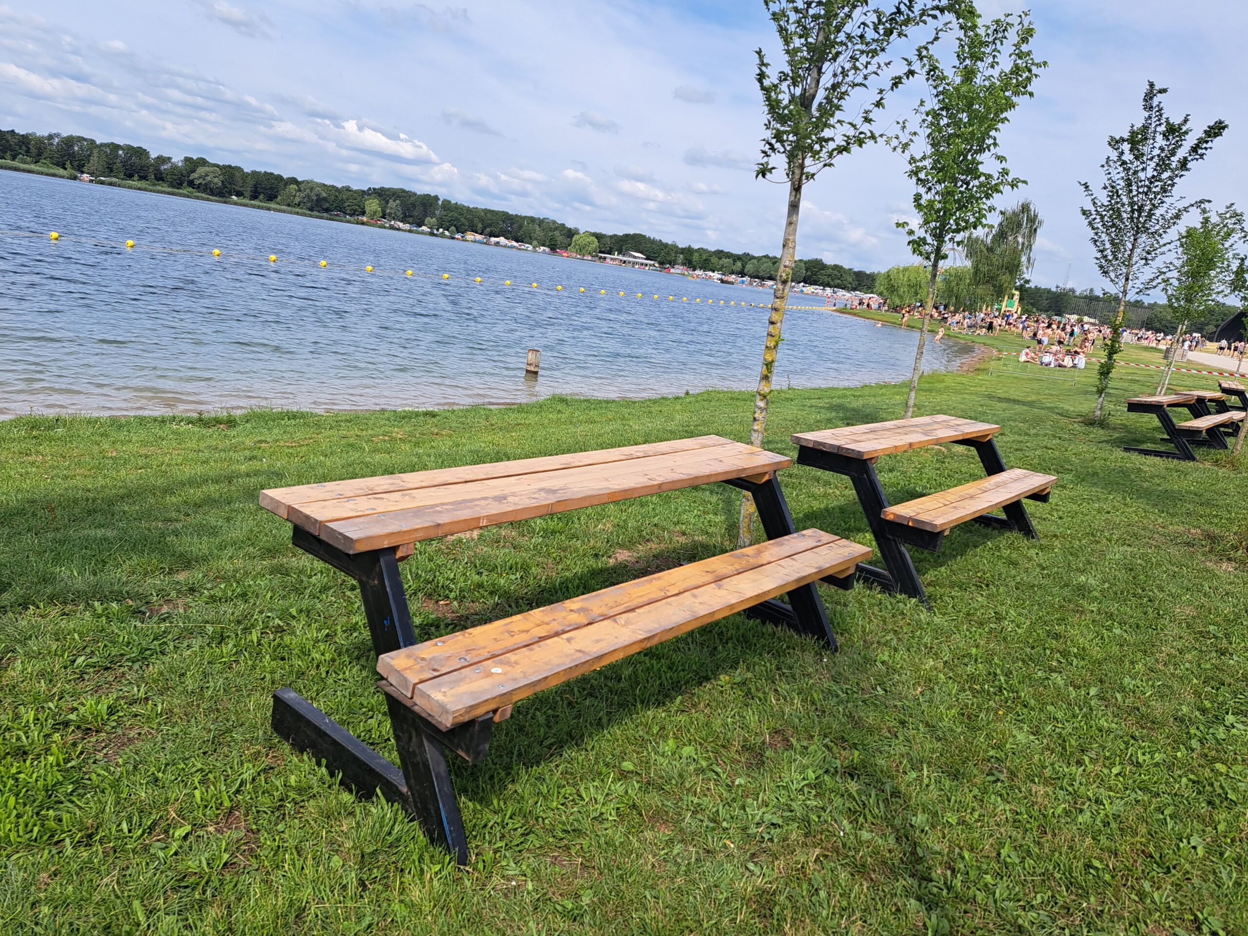 Halve picknick banken, een stalen poot in de vorm van een Z met houten bladen als tafel en bank. makkelijk in elkaar te schroeven met tellerkoppen